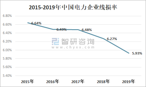 2015-2019年中國電力企業線損率不斷下降,2019年中國電力企業線損率為5.93%,較2018年下降0.34%。