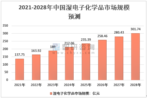 隨著國家對半導體、顯示面板、光伏產業的大力扶持和成本競爭優勢,半導體、顯示面板、光伏化學品材料國產化需求將成為趨勢,國內企業成本優勢、地域優勢、合作研發優勢、快速交貨優勢將得以迅速體現,未來發展潛力加大,預計到2028年中國濕電子化學品市場規模達到301.74億元。