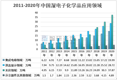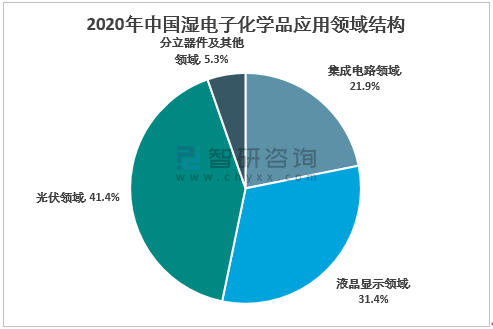 2020年國內液晶顯示領域用濕電子化學品需求28.72萬噸,占比31.4%;光伏領域用濕電子化學品需求37.87萬噸,占比41.4%;集成電路領域用濕電子化學品需求19.99萬噸,占比21.9%;分立器件及其他領域用濕電子化學品需求量4.89萬噸,占5.3%。