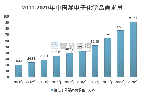 目前,國內濕電子化學品行業規模以上生產企業有30多家。國內濕電子化學品生產企業在經營規模、產品類別、戰略重點等方面與國際企業存在一定差異。2020年,我國濕電子化學品產量達到了57.44萬噸,國內需求量91.47萬噸。