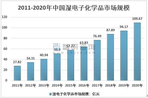 根據測算,2019年我國濕電子化學品市場規模約94.17億元,2020年市場規模增長至109.67億元,近幾年我國濕電子化學品市場規模情況如下圖所示: