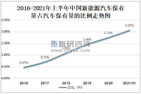 中國新能源汽車保有量占汽車保有量的比例逐年攀升,2021年上半年中國新能源汽車保有量占汽車保有量的2.07%,較2016年的0.47%增長了1.59%,未來將繼續(xù)保持增長。