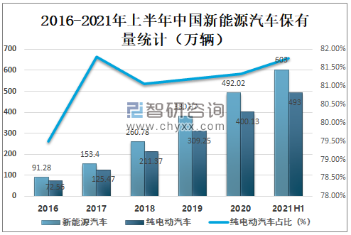 在政策的大力推動(dòng)下,新能源汽車產(chǎn)業(yè)迅速發(fā)展,2021年上半年中國新能源汽車保有量達(dá)603萬輛,其中純電動(dòng)汽車保有量達(dá)493萬輛,占新能源汽車保有量的81.76%。