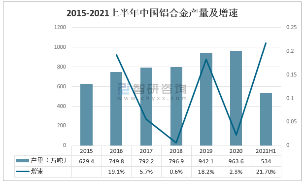 2015-2021上半年中國(guó)鋁合金產(chǎn)量及增速