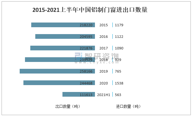 2015-2021上半年中國(guó)鋁制門(mén)窗進(jìn)出口數(shù)量