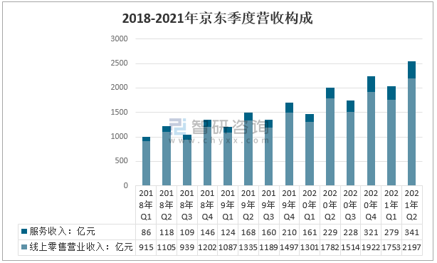 從營業收入構成來看,2021年二季度,京東線上零售營業收入2197億元,較2020年二季度增長415億元;服務收入341億元,較2020年二季度增長112億元。