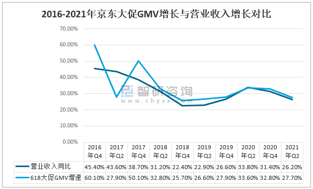 2016-2021年京東大促GMV增長與營業收入增長對比