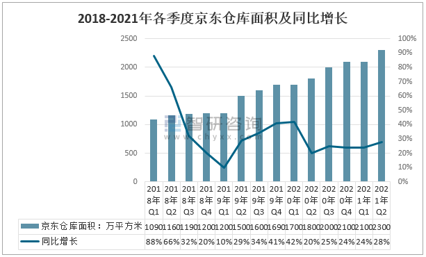 2018-2021年各季度京東倉庫面積及同比增長