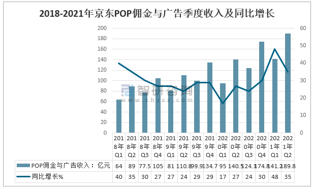 2018年以來,京東POP傭金與廣告季度收入呈增長態勢,2021年一季度,京東POP傭金與廣告收入141.2億元,較2020年同期增長46.2億元,同比增長48%;2021年二季度,京東POP傭金與廣告收入189.8億元,較2020年同期增長49.3億元,同比增長35%。