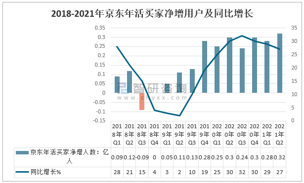 2018-2021年京東活躍買家凈增用戶及同比增長