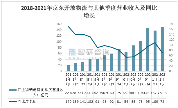 從京東開放物流與其他季度營業收入來看,2021年二季度,京東開放物流與其他增速持續高位增長,開放物流與其他季度營業收入151.3億元,增長率高達72%。