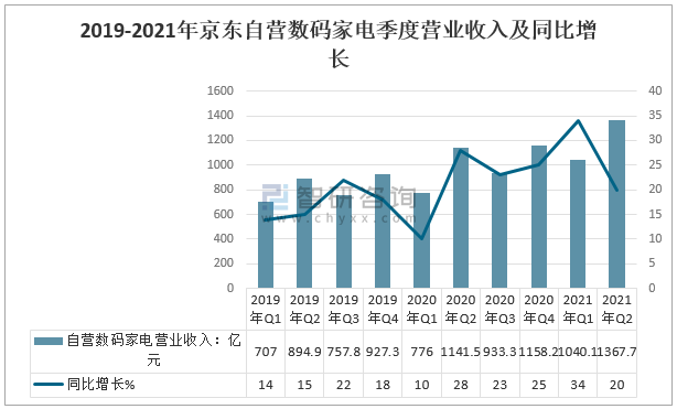 2019-2021年京東自營數碼家電季度營業收入及同比增長