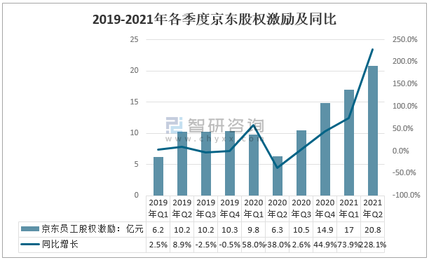 從2020年三季度以來,京東股權激勵增長明顯,2020年三季度京東員工股權激勵10.5億元,同比增長2.60%;2020年四季度京東員工股權激勵14.9億元,同比增長44.90%;2021年一季度京東員工股權激勵17億元,同比增長73.90%;2021年二季度京東員工股權激勵20.8億元,同比增長228.10%。