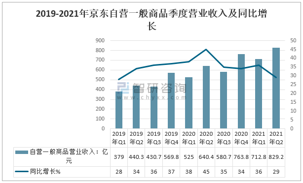 2019-2021年京東自營一般商品季度營業收入及同比增長