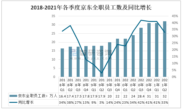 2021年一季度京東全職員工數31萬人,較2020年同期新增了近9萬人,同比增長41.0%;2021年二季度京東全職員工數32萬人,較2020年同期新增了近12萬人,同比增長33.0%。