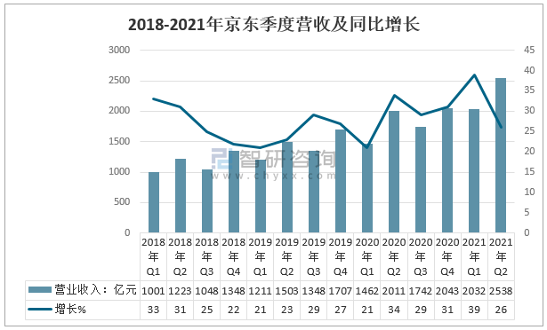 2018年二季度,京東營業收入1223億元,同比增長31%;2019年二季度,京東營業收入1503億元,同比增長23%;2020年二季度,京東營業收入2011億元,同比增長34%;2021年二季度,京東營業收入2538億元,同比增長26%,超出當之前預期值2485億。