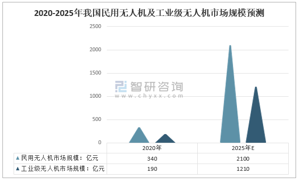 2020年中國民用無人機行業市場規模約達到340億元,其中工業級無人機的市場規模約達到190億元;預計到2025年,中國民用無人機行業的市場規模有望突破2100億元,年均復合增長率達44%,其中工業級無人機行業的市場規模有望突破1210億元。