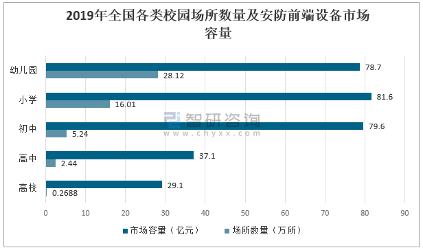 2019年全國各類校園場所數量及安防前端設備市場容量