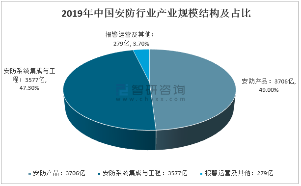 智研咨詢發布的《2021-2027年中國安防行業發展動態分析及市場前景規劃報告》數據顯示:從產業構成上看,2019年安防產品總收入約為3706億元,占總產值49%;安防系統集成與工程市場約為3577億元,占比47.3%;報警運營市場及其他約為279億元,占比3.7%。
