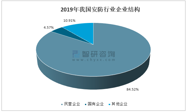 在安防行業的競爭形態方面,2019年,安防行業中民營企業的數量最多,占比達84.52%,是我國安防市場的重要組成部分;其次是國有企業,企業數量占比約4.57%。