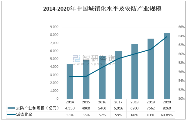 2014-2020年,中國城鎮化水平持續大幅提高。據國家統計局數據,2014年到2020年,中國城鎮化水平從55%增長至63.89%。但隨著城市化進程提高,越來越多的人聚集在城市中,對城市治理以及公共安全管理帶來嚴峻挑戰,安防行業地位日益凸顯。安防產業規模也隨著城市化進程提高逐步提升,2020年中國安防產業規模達到8260億元。