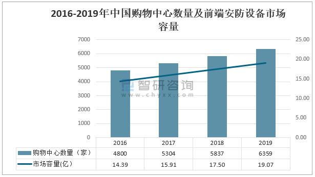 2016-2019年中國購物中心數量及前端安防設備市場容量