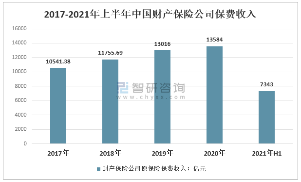 2017-2021年上半年中國財產保險公司保費收入