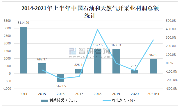 2014-2021年上半年中國石油和天然氣開采業利潤總額統計