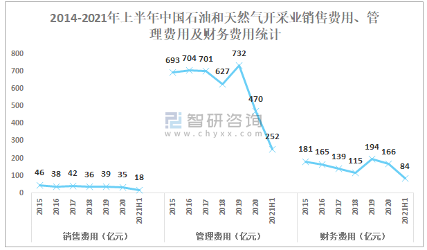 2014-2021年上半年中國石油和天然氣開采業銷售費用、管理費用及財務費用統計
