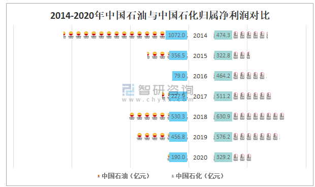 2014-2020年中國石油與中國石化歸屬凈利潤對比