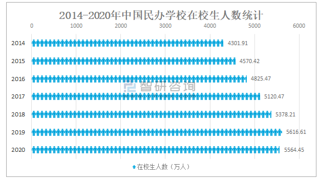 2014-2020年中國民辦學校在校生人數統計