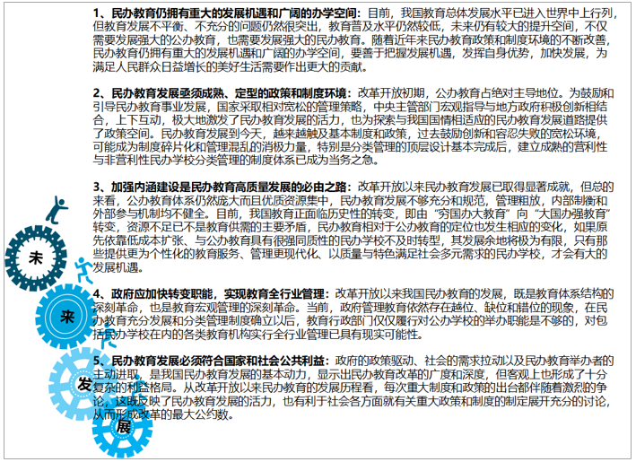未來一個時期,民辦教育可以而且應該大有作為,民辦教育仍擁有重大的發展機遇和廣闊的辦學空間,但民辦教育發展亟須成熟、定型的政策和制度環境,加強內涵建設,政府應加快轉變職能,實現教育全行業管理,且民辦教育發展必須符合國家和社會公共利益。