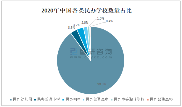 2020年中國民辦幼兒園數量占民辦學校總數的90.0%,占比非常大;民辦普通小學數量占民辦學校總數的3.3%;民辦初中數量占民辦學校總數的3.2%;民辦普通高中數量占民辦學校總數的2.0%;民辦中等職業學校數量占民辦學校總數的1.0%;民辦普通高校數量占民辦學校總數的0.4%。