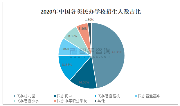 2020年中國民辦幼兒園招生人數占民辦學校招生總人數的47.35%,占比最大;民辦初中招生人數占民辦學校招生總人數的14.08%;民辦普通高校招生人數占民辦學校招生總人數的13.65%;民辦普通高中招生人數占民辦學校招生總人數的8.86%;民辦普通小學招生人數占民辦學校招生總人數的8.39%;民辦中等職業學校招生人數占民辦學校招生總人數的5.86%。