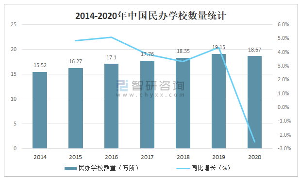 民辦教育是我國教育事業的重要組成部分,我國人口眾多,教育需求巨大,公共教育資源早已無法滿足居民對于教育的需求,民辦教育在我國教育發展歷程中承擔著越來越多的教育任務經過近30余年的發展,中國民辦教育從無到有、從小到大、從弱到強,已經形成了有一定規模的民辦教育體系,2019年中國民辦學校數量達19.15萬所,較2018年增加了0.80萬所,同比增長4.4%,2020年較2019年有所下滑,2020年中國民辦學校數量為18.67萬所,較2019年減少了0.48萬所,同比減少2.5%。