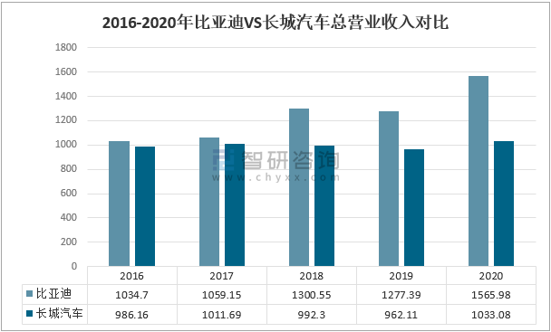 數據顯示:從營業總收入來看,比亞迪總營業收入較長城汽車營業收入整體稍微偏高,2020年,比亞迪總營業收入1565.98億元,較上年增加288.59億元,同比增長22.59%;長城汽車總營業收入1033.08億元,較上年增加70.97億元,同比增長7.38%。