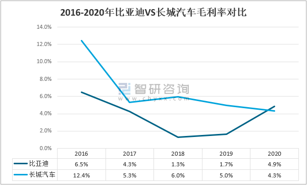 從毛利率來看,2016-2019年長城汽車毛利率明顯高于比亞迪,到2020年比亞迪毛利率稍高于長城汽車,比亞迪毛利率4.9%,較上年提升3.2個百分點;長城汽車毛利率4.3%,較上年下降0.7個百分點。