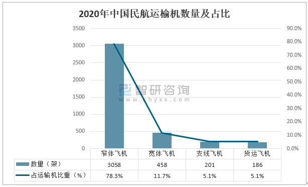 中國民用航空業發展迅速,2020年底,通用航空在冊運輸飛機總數達到3903架,比上年底增加85架;其中,窄體飛機3058架,占運輸機的78.3%;寬體飛機458架,占運輸機的11.7%;支線飛機201架,占運輸機的5.1%;貨運飛機186架,占運輸機的5.1%。