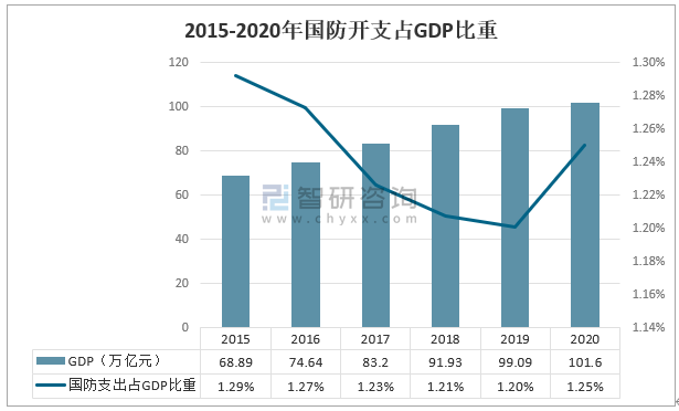 近年來,隨著GDP增速逐漸趨緩,我國的國防投入的增速也逐漸趨于穩定。2020年,我國GDP為101.6萬億元,較上年增加2.51萬億元,國防投入占GDP的比重為1.25%;我國國防支出占GDP的比重也遠不如其他國家的水平,我國的國防支出有著充足的提升空間。