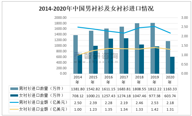 智研咨詢發布的《2021-2027年中國襯衫行業市場運營格局及前景戰略分析報告》數據顯示:2020年中國女襯衫進口數量為603.74萬件,進口金額為1.31億美元;男襯衫進口數量為1163.33萬件,較女襯衫高出559.59萬件,進口金額為2.18億美元,較女襯衫高出0.87億美元。
