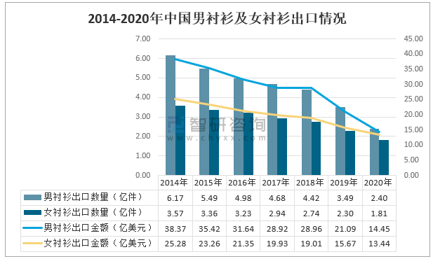 2014-2020年中國男襯衫及女襯衫出口情況