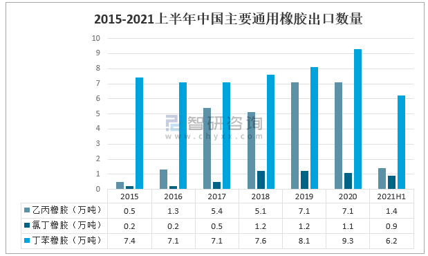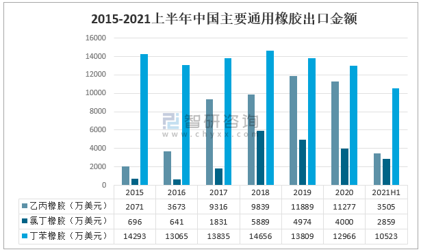 據中國海關數據,2021上半年中國乙丙橡膠出口金額為3505萬美元;氯丁橡膠出口金額為2859萬美元;丁苯橡膠出口金額為10523萬美元。