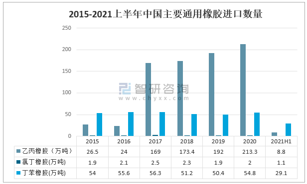 近年來,中國合成橡膠行業逐步呈現出產能集中度高、產品性能要求高、環保要求高、下游用戶聚集度高等特點,中國合成橡膠在消費量、產能、進口量和下游輪胎產量方面均居世界第一。2021上半年中國合成橡膠進口數量為220.7萬噸;出口數量為32噸。