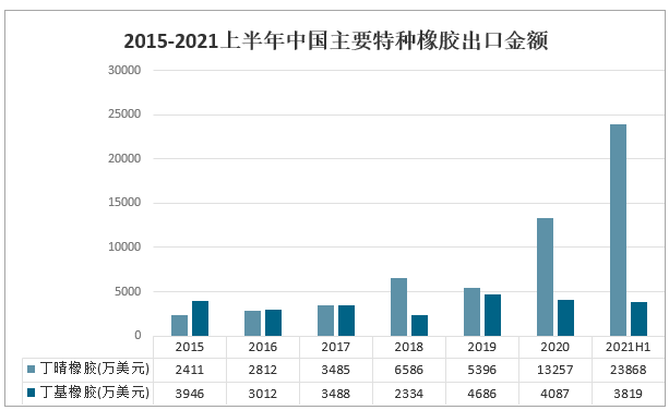 據海關數據顯示,2021上半年中國丁晴橡膠出口金額為23868萬美元;中國丁基橡膠出口金額為3819萬美元。