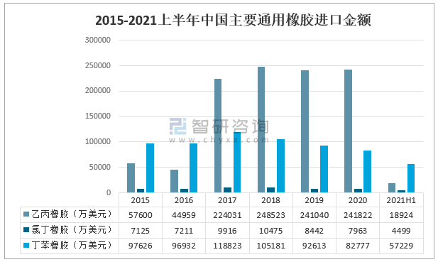 中國海關數據顯示,2021上半年中國乙丙橡膠進口金額為18924萬美元;氯丁橡膠進口金額為4499萬美元;丁苯橡膠進口金額為57229萬美元。