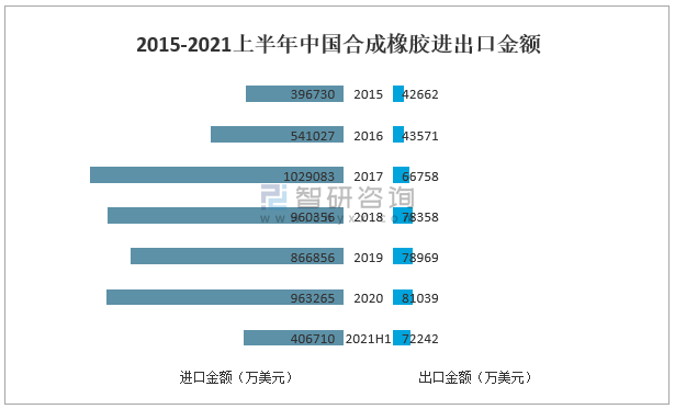 據中國海關數據,2021上半年中國合成橡膠進口金額為406710萬美元;中國合成橡膠出口金額為72272萬美元。