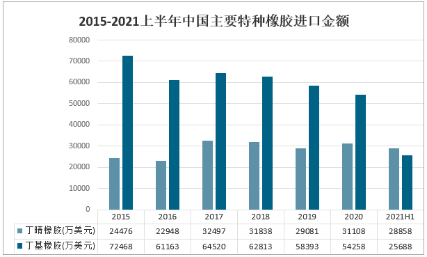 2021上半年中國主要特種橡膠進口中,中國丁晴橡膠進口金額為28858萬美元;中國丁基橡膠進口金額為25688萬美元。