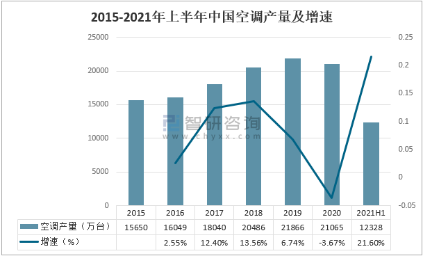 2015-2021年上半年中國空調產(chǎn)量及增速