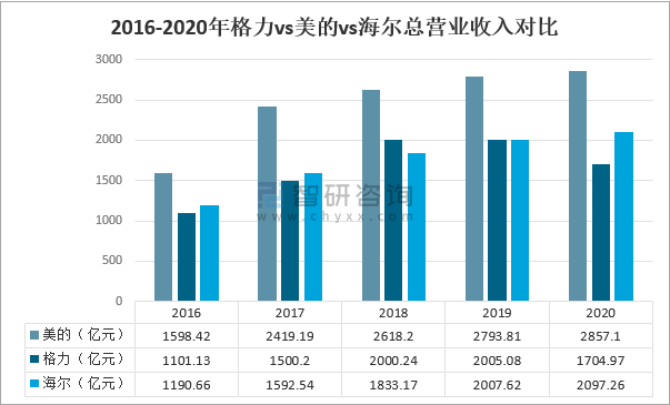 2016-2020年格力vs美的vs海爾總營業(yè)收入對比