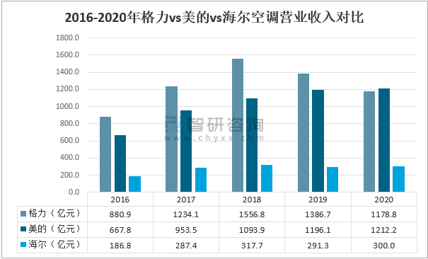 2016-2020年格力vs美的vs海爾空調營業(yè)收入對比